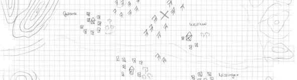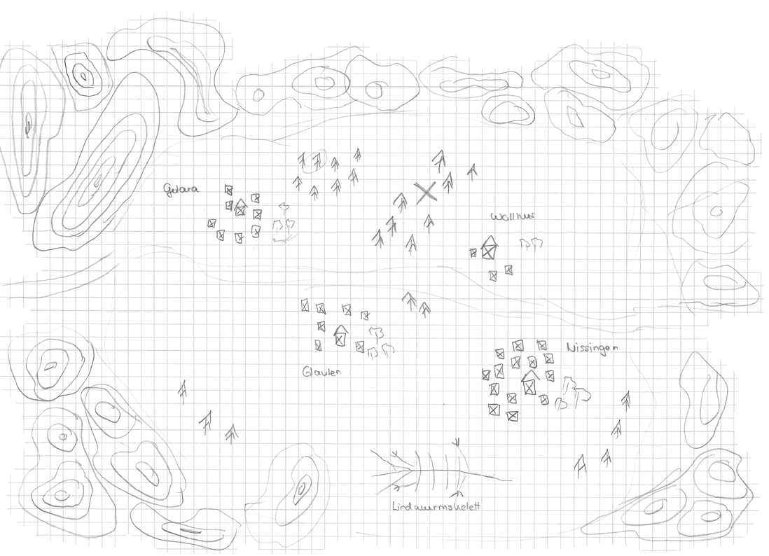 Wir erreichen ein Dorf. Auf dem Marktplatz ist einer der Türme, etwa 15 Schritt hoch, ein eckiger Wachturm. Leute sind keine zu sehn, die scheinen versteckt zu sein. Wir betreten die Schenke. Das Dorf heißt Gerlara.